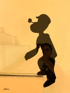 Popeye walking up the stairs with me.